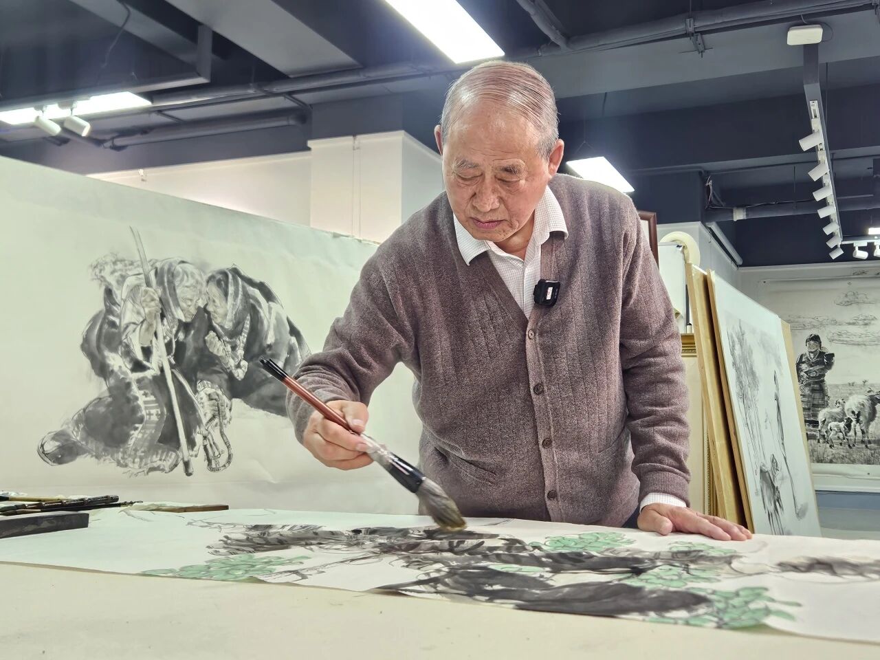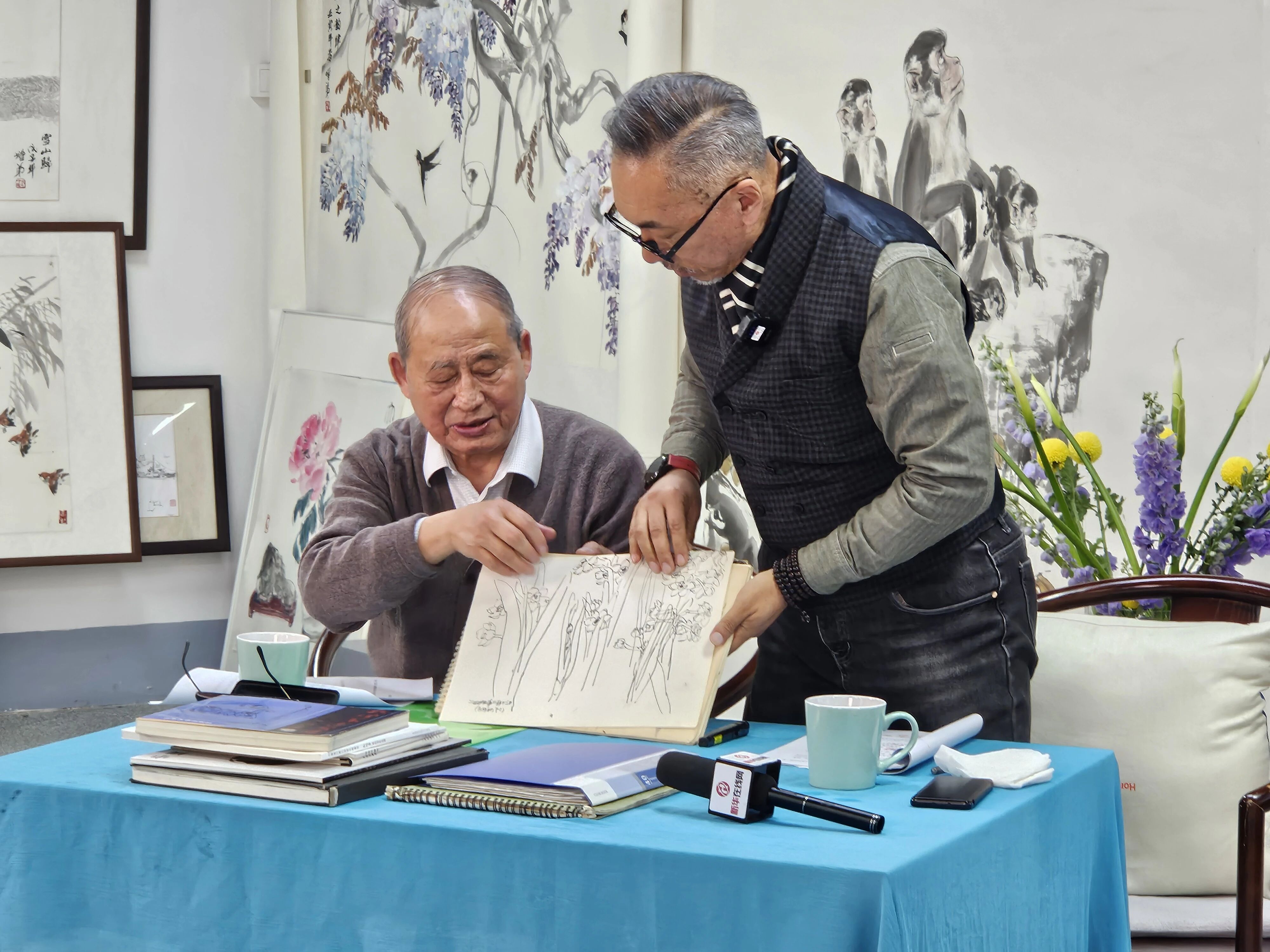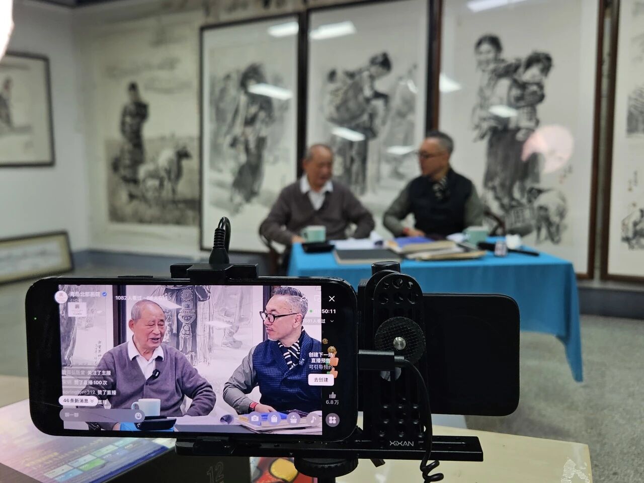 宽敞的直播间里,挂满了孙老各个时期创作的花鸟画、人物画和速写作品,为直播现场营造出浓厚的艺术气息。