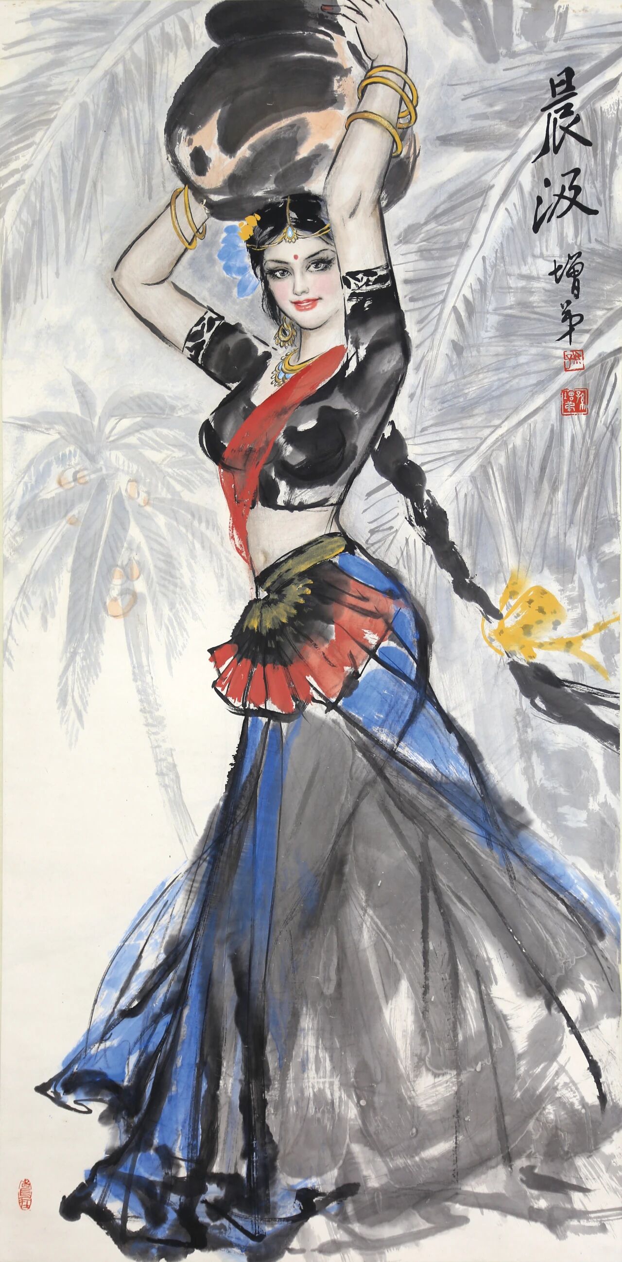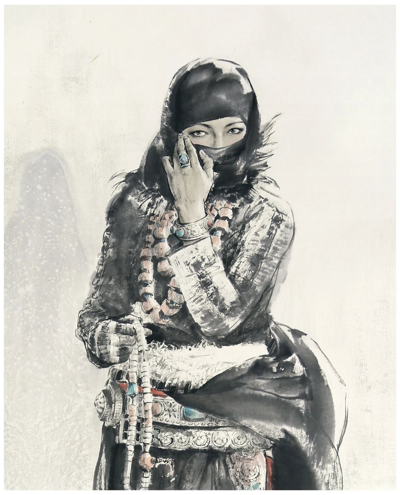 连续十年的西部藏区的写生采风和创作活动,形成了他独特的艺术风格。他从传统技法入手,并柔入现代理念,将中国画的水墨与线条同西画的素描、光影相结合、充分体现中国画写意特色的同时,把速写的成分大胆的运用于创作中,以水墨为主,淡彩补充,用水墨表达藏族服饰丰富的色彩,收到了意想不到的效果,也明显区别于其他画家的表现手法。
