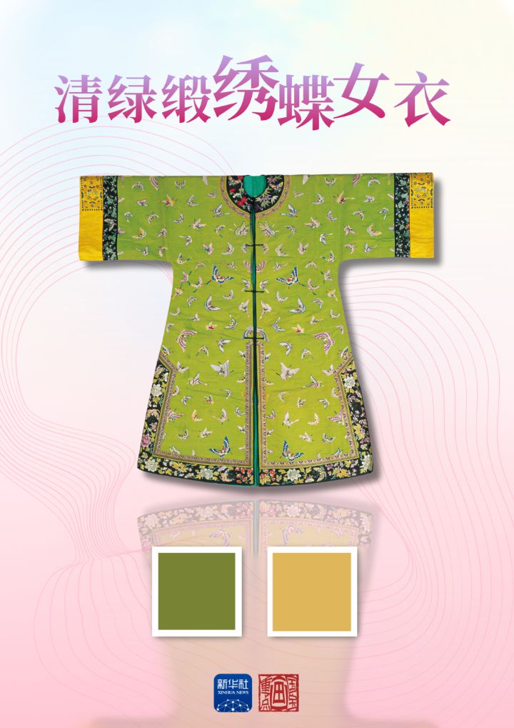 直袖、对襟、圆领,这件清绿缎绣蝶女衣采用绿缎面料,袖口、领边及衣襟下摆镶黑缎边,袖口又接一段黄绸边,清新典雅。
