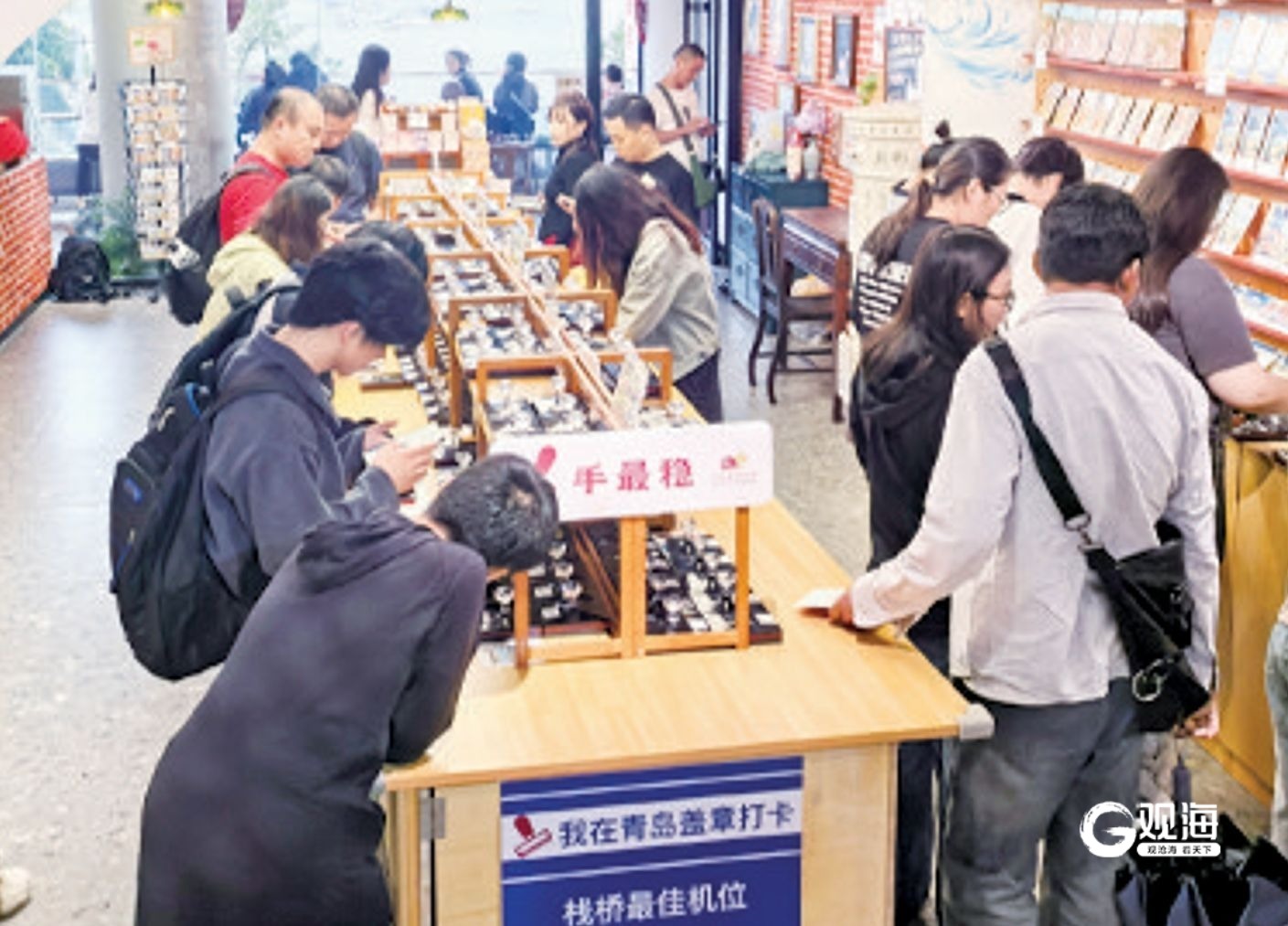 “小红楼美术馆栈桥店赶在国庆节前(9月28日)开业,就是为了承接老城假日流量。”华能大厦音乐家广场负责人许征雄介绍,“这里不仅有小红楼美术馆同款盖章与文创产品,站在店外的海景阳台上,还可以远眺栈桥和小青岛景区。每天下午,我们还安排了吉他弹唱演出,游客可以边欣赏音乐、边品味咖啡、边享受海景,为青岛之旅增添一份独特韵味。”