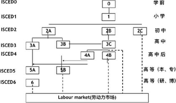 (十五)关于技术型人才的独立地位。冯雯雯、夏建国依据 1997 年联合国教科文组织重新修订的《国际教育标准分类》(International Standard CIassification ofEducation 。 ISCED) 文件,认为按教育体系的"发展阶梯"划分为 7 个层次,其中第 5 层次是包含专科与本科两个层次。值得我们特别关注的是该《标准》把 JISHU JIAOYU 技术教育这第 5 层次划分为"A?和"B?两种类型。"A?是"面向理论基础、研究准备、进入高技术要求的专业课程";"B?是一种"定向于某个特定职业的课程计划",是"实际的、技术的、具体职业的特殊专业课程"Practical。Technical, occupational specificprogramme)。"B?的课程尽管培养的不完全是技术型人才,但主要是技术型人才。[8] 见图 2。