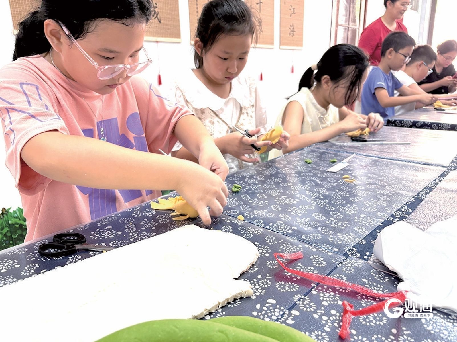 小学生在老字号玉柱花饽饽店内体验面塑DIY。