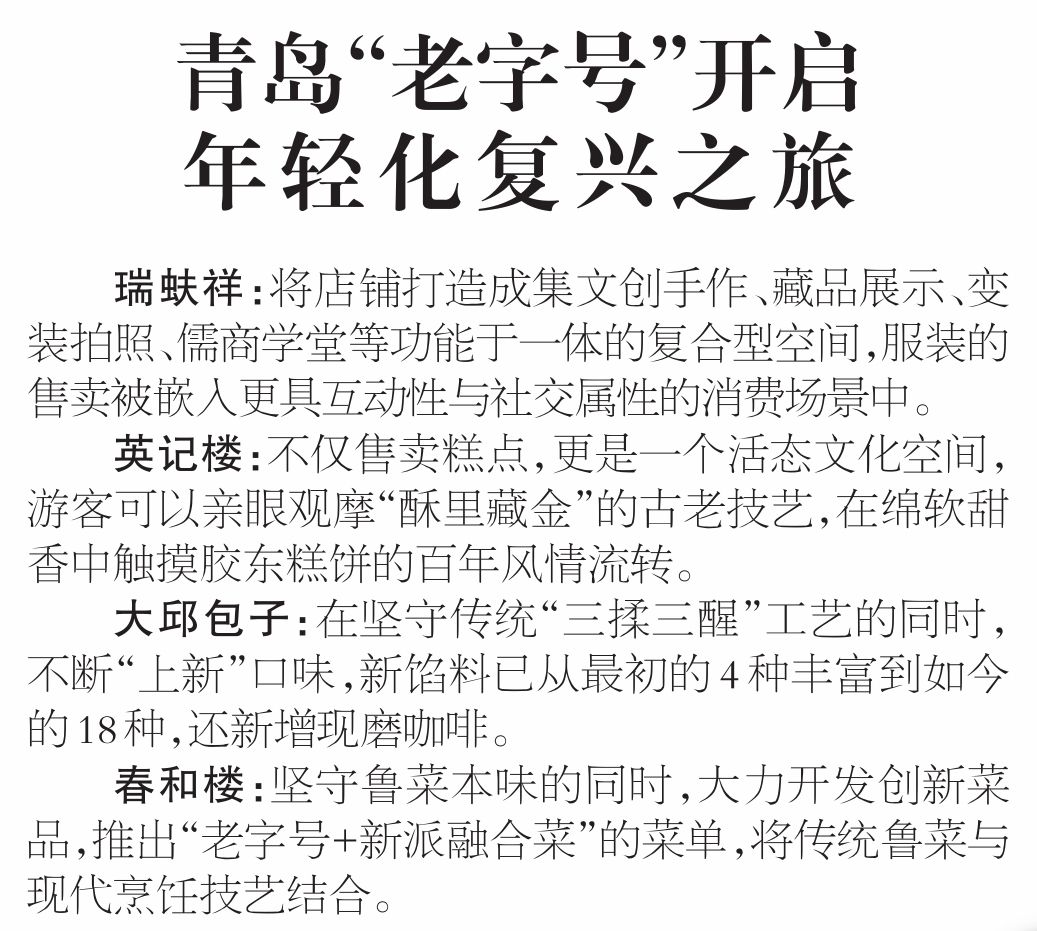 对“老字号”而言,深厚的文化底蕴是其商业传承的根基,而持续的创新求变是激活其新消费潜力的关键。无论是在百年中山路新潮流场域布局,还是在不断创新中实现年轻化“突围”,我们期待青岛老字号从老的“情怀牌”升级为新的“消费引擎”。(青岛日报/观海新闻记者 曹森 余瑞新)