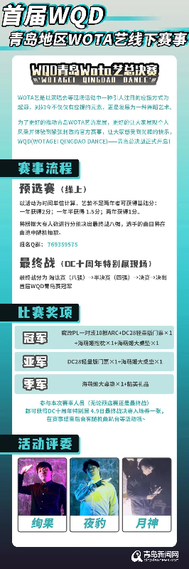 WQD青岛Wota艺总决赛等你来挑战!只要报名参与就可以获得DC十周年特别展4.9日最终决赛入场券一张。快来报名参与,展示个人风采、体验紧张刺激的感受,获得冠亚季军还有精美礼品相送。