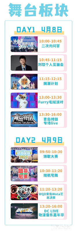 二次元问答、刘琮个人见面会、国潮计划、Furry毛绒排队、青岛特辑专场live、猜歌大赛、随机宅舞、WQD青岛Wota艺总决赛、DC LIVE动漫音乐嘉年华等几大板块将在主舞台轮番登场,带来与众不同的精彩,闪耀整个舞台,一起来打Call应援吧。