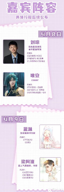 本次漫展活动为期两天,每天都将邀请人气嘉宾到现场与游客们交流互动。4月8日,知名配音演员、青年配音导演刘琮将作为嘉宾现身见面会,作为电影《流浪地球》中MOSS的配音演员,刘琮这次将携代表作进行现场签售;知名coser唯安将在个人签售会上与现场粉丝见面。4月9日,超人气漫画家、作家梁阿渣,知名畅销书作家蓝淋将分别进行作品《刻在眉眼间》1-2册、《从谎言开始》色纸,《眼中星》1-2册、《意外事故》《君子之交》签售,近距离接触偶像的机会你可千万不要错过!