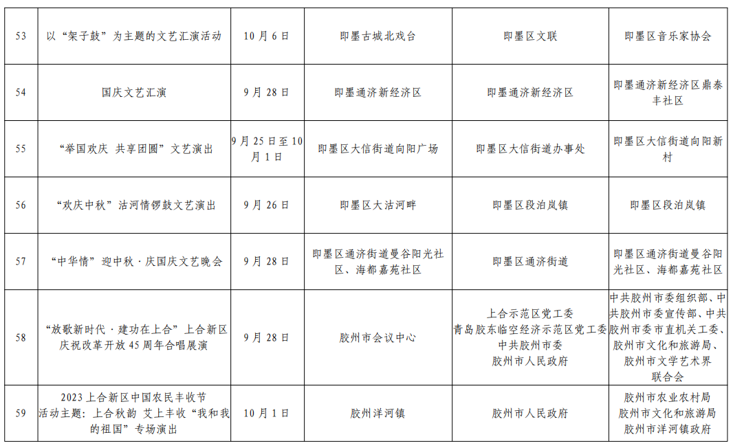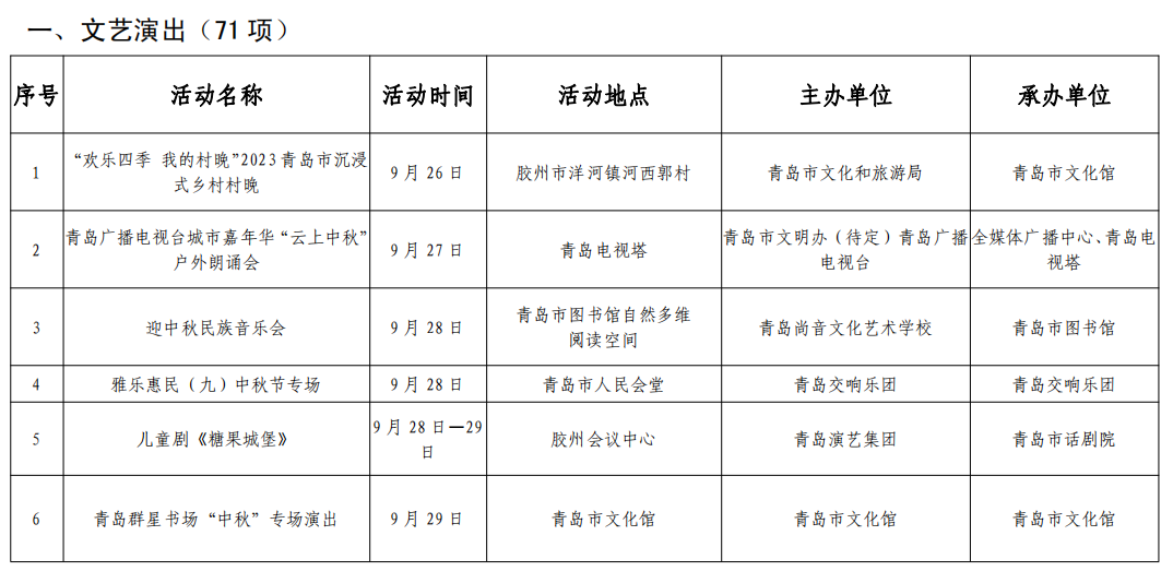 “明月映山海”2023青岛市中秋晚会、2023“万家团圆迎中秋四海欢腾庆国庆”青岛市大型群众艺术文艺晚会以及一系列优秀电视剧展播、各大影院优秀影片上映等,更将为市民和游客的假日生活增添更多精彩。