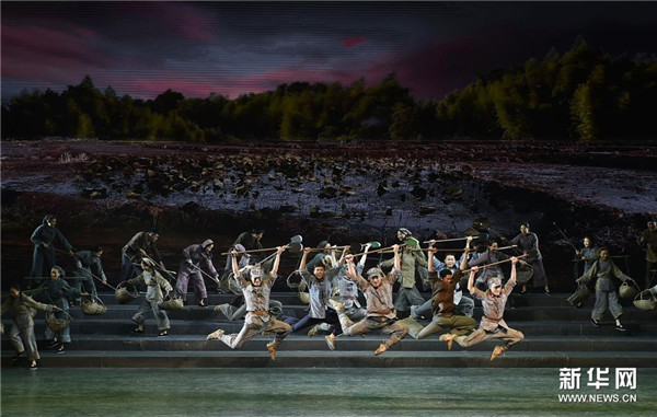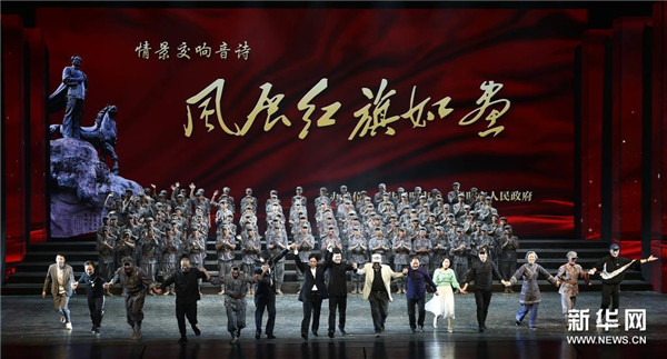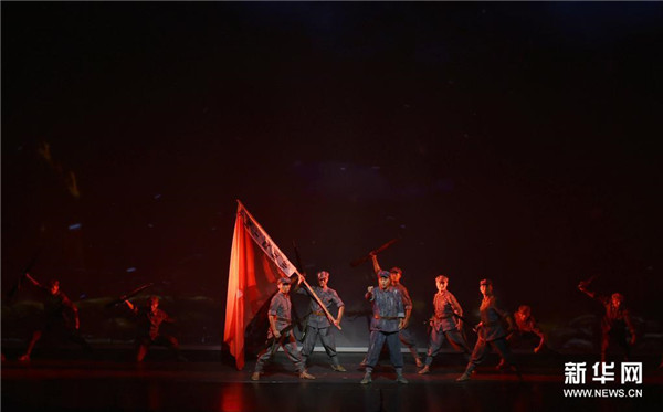 4月25日,演员在《风展红旗如画》中表演。当晚,由福建省歌舞剧院等单位共同编创的情景交响音诗《风展红旗如画》在北京国家大剧院上演。该剧以苏区故事和湘江战役为背景,通过交响乐、合唱、舞蹈、情景表演等多种艺术形式的巧妙结合,讲述了土地革命战争时期,福建三明苏区儿女为建立和巩固根据地,展开艰苦卓绝革命斗争的感人故事。