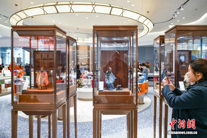 在天津首家市内免税店中,近期展出《福星》《忠义千秋》等“泥人张”彩塑,吸引不少海外旅客驻足端详。