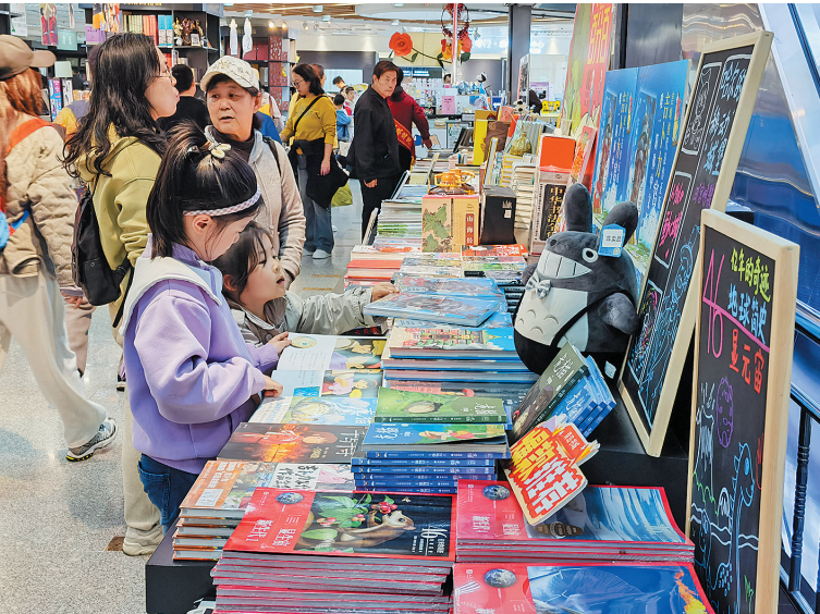 书城里琳琅满目的书籍吸引市民前来阅读、选购。王雷 摄