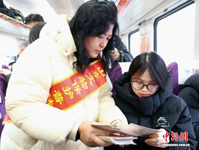 大学生李昆朋是一名轨道交通“发烧友”,他特意带着小型摄像机乘坐“文物宝藏”列车。“寒假期间听说山东文物研学主题旅游列车开通,就一直盼着来试乘,想用镜头记录下沿途的风景和收获。”他说,走进列车,仿佛置身可移动的文博展厅,文物从橱窗里走出,变成身边可触摸、可参与的体验场景,感觉很新奇。